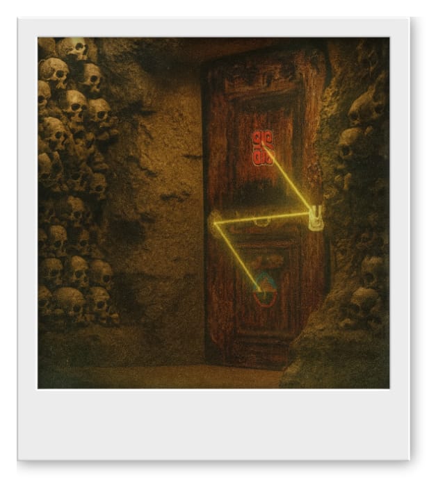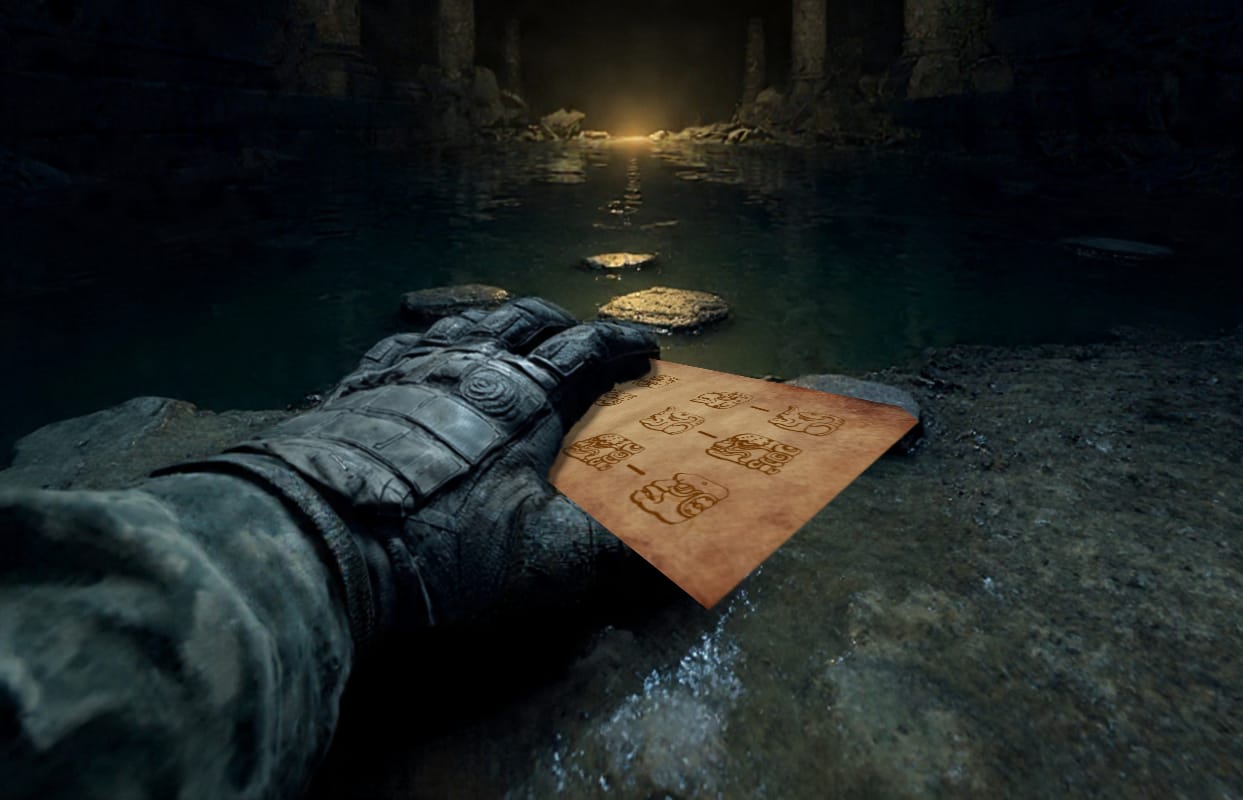 You open the door to the tunnel and notice a series of stepping stones poking out of murky water. A body is laying crumpled at your feet, with a dart lodged in its side. The man, who is not one of the archaeologists, is clutching a piece of worn leather in his hand.