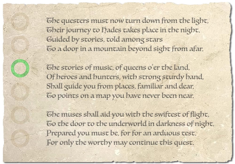 I am Calliope, daughter of Zeus, and the first muse. I have been seeking a savior to be a hero to all mankind. In these dark days, there is little hope in the world of men. I beseech you to undertake a quest to find Pandora’s jar and return hope to the world. This quest can only be accomplished by a mortal - a mortal who is brave and clever and committed to the cause of mankind. I and my sisters shall support your efforts with the knowledge and skills that we alone can impart during your campaign.Kleio